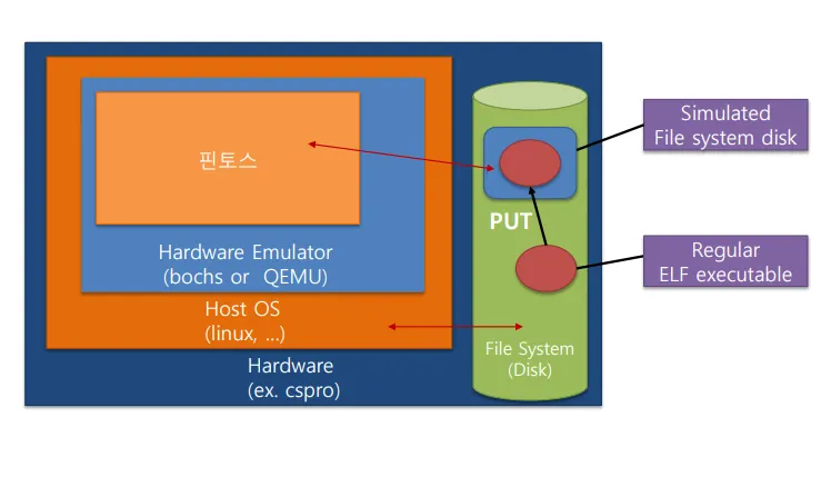 실제 파일 시스템에 올라와있는 파일들을 핀토스에서 직접 불러서 실행시키고, Host OS가 쓰는 구조인듯?