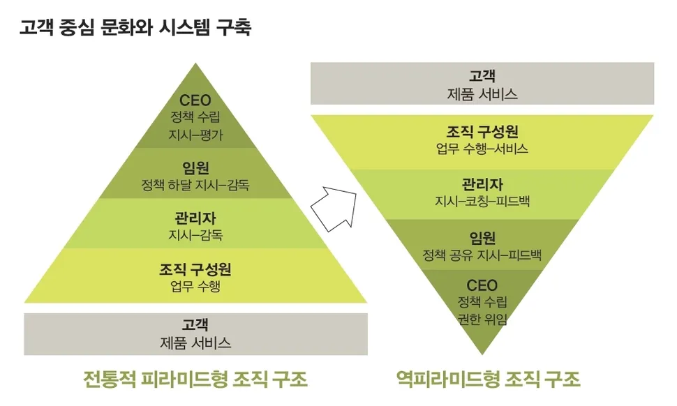 이전 피라미드 구조에서는 결정권자들만이 조직의 핵심 가치를 공유하고, 결정 사항을 밑으로 하달하면 되기 때문에 Vision, Value, Mission의 비중성이 크지 않았다.