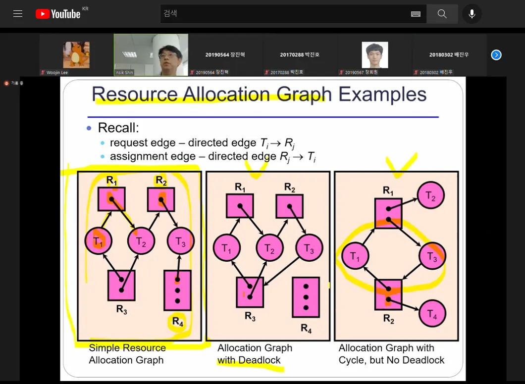 이 때, 할당에서 가능한 자원이 없는 상태, 그러니까 무조건 Circular라고 다 되는건 아니고, 가능한 자원이 없는 원이 만들어질 때, 그리고 서로가 서로를 들고 있을 때, 데드락이 발생함.