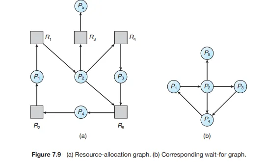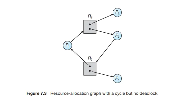 자원 할당 그래프에서 사이클이 없다면 교착 상태가 아니고, 사이클이 있다면 교착 상태일 수도 있고 아닐 수도 있다.